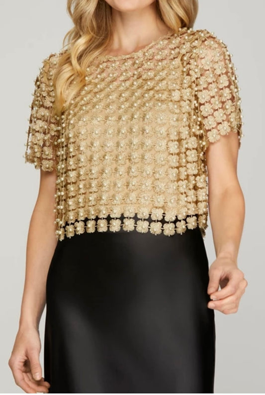 Sold out1590 Crochet Lace Pearl Beaded Top